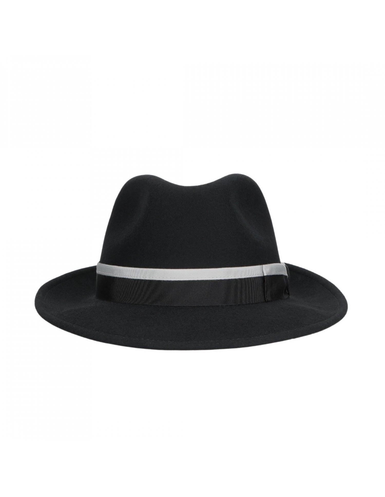 Cappello Ricky Borsalino realizzato in feltro di lana, sfoderato, con tesa media di 6 cm e una cinta in cannetè di 3 cm bicolore con bordo a contrasto.