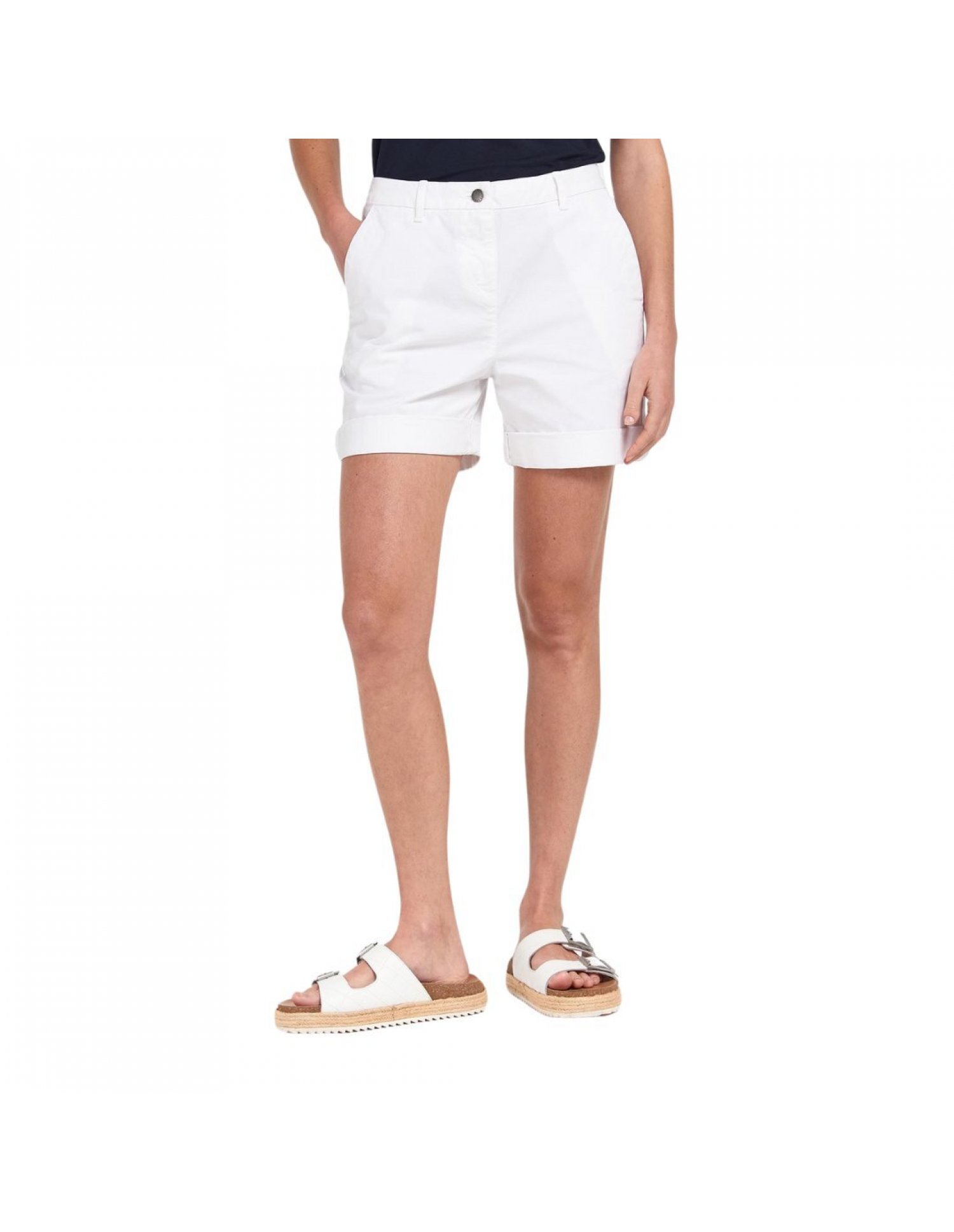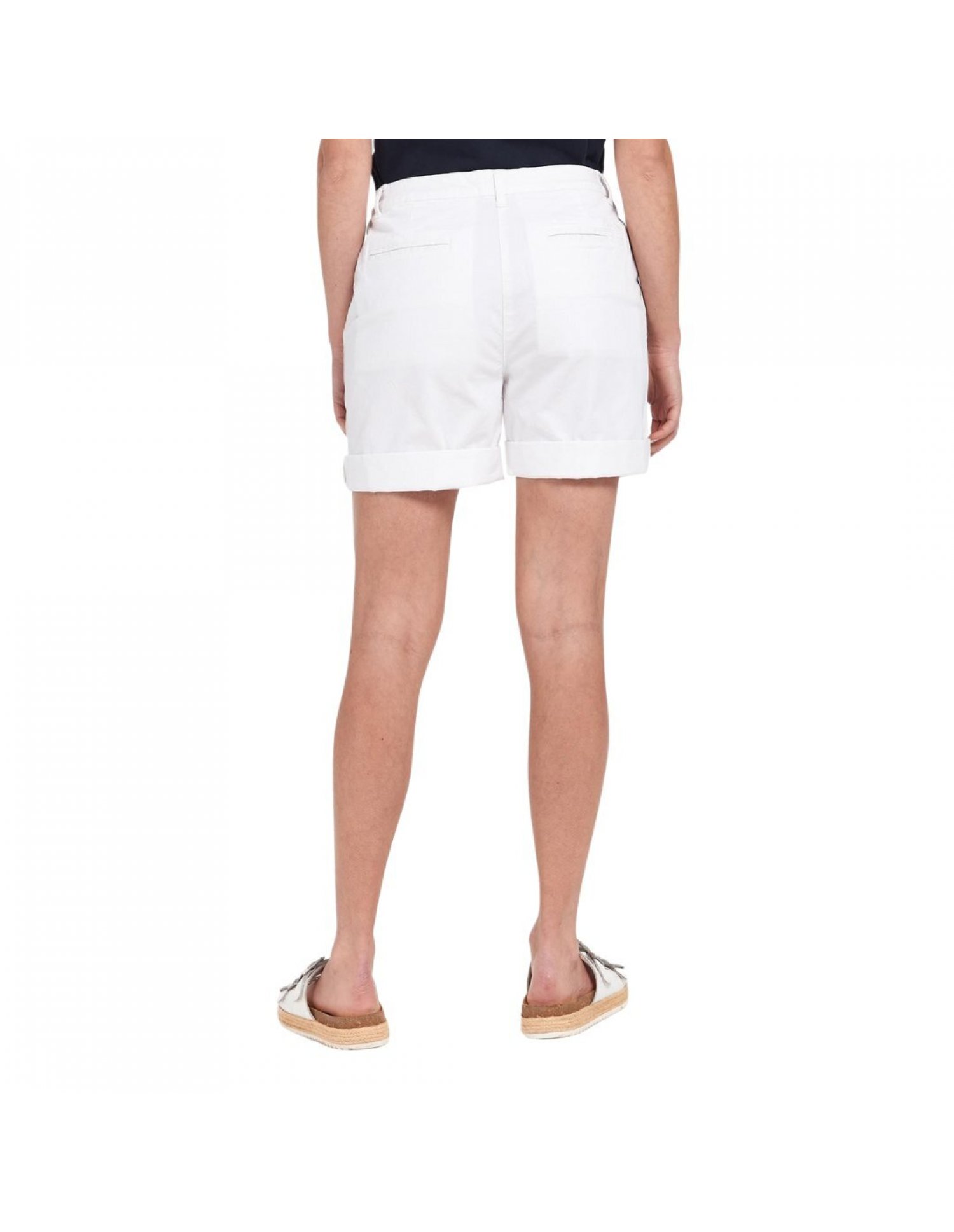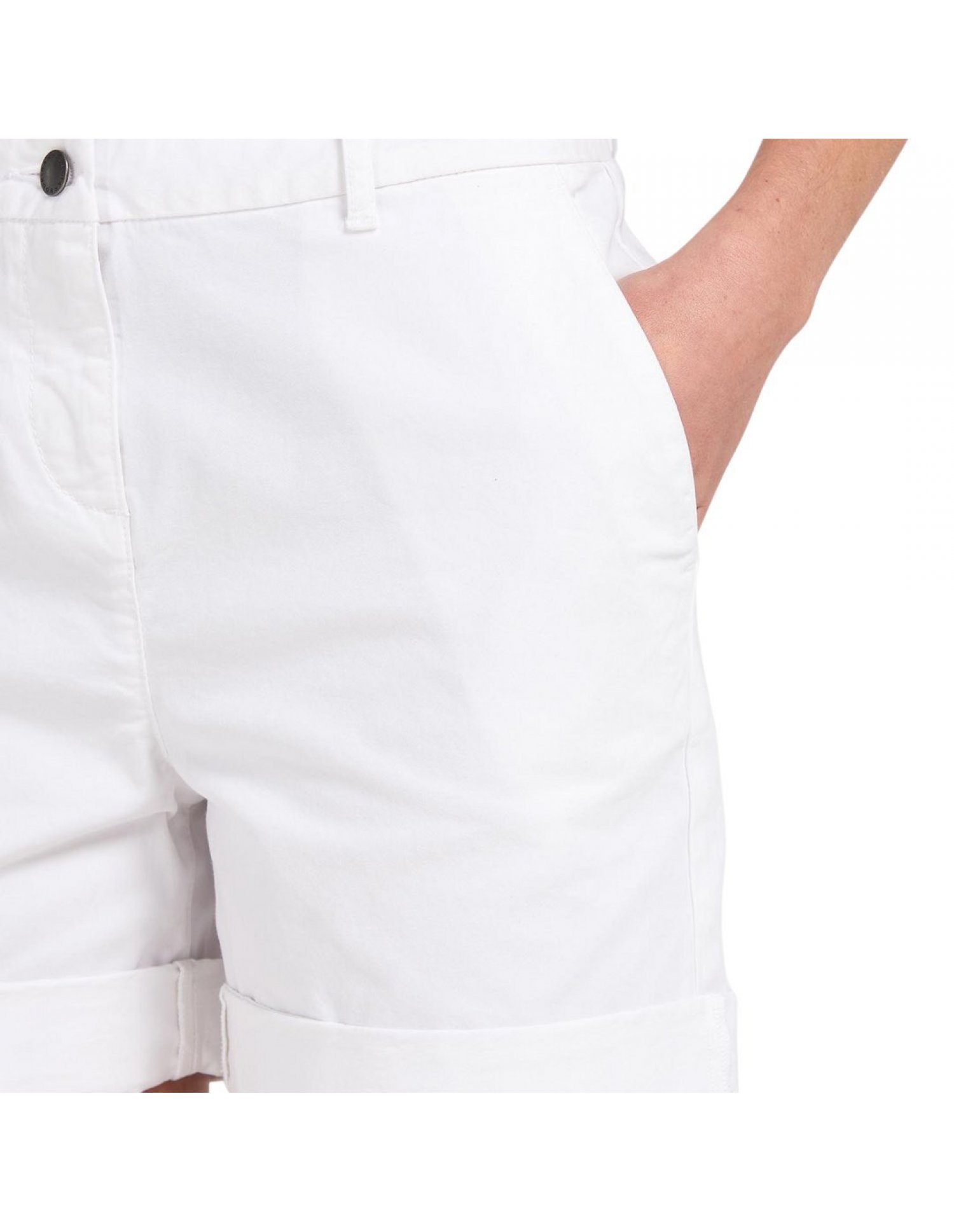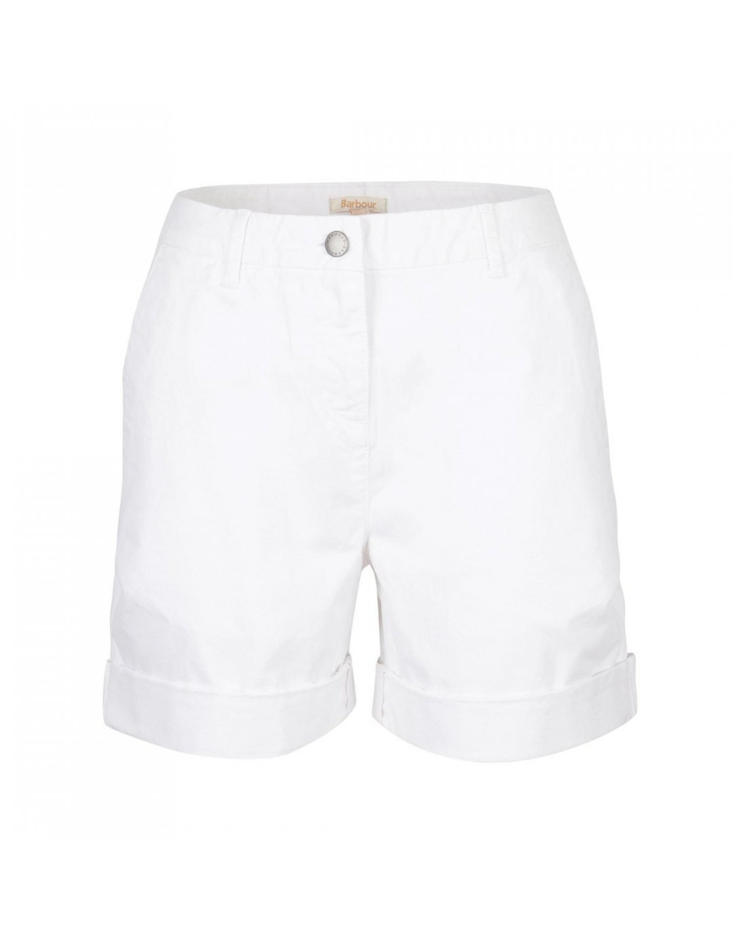 I pantaloncini chino Barbour da donna presentano un design pulito e semplice con risvolti, tasche anteriori all'americana, chiusura con zip e tasche posteriori a filetto.